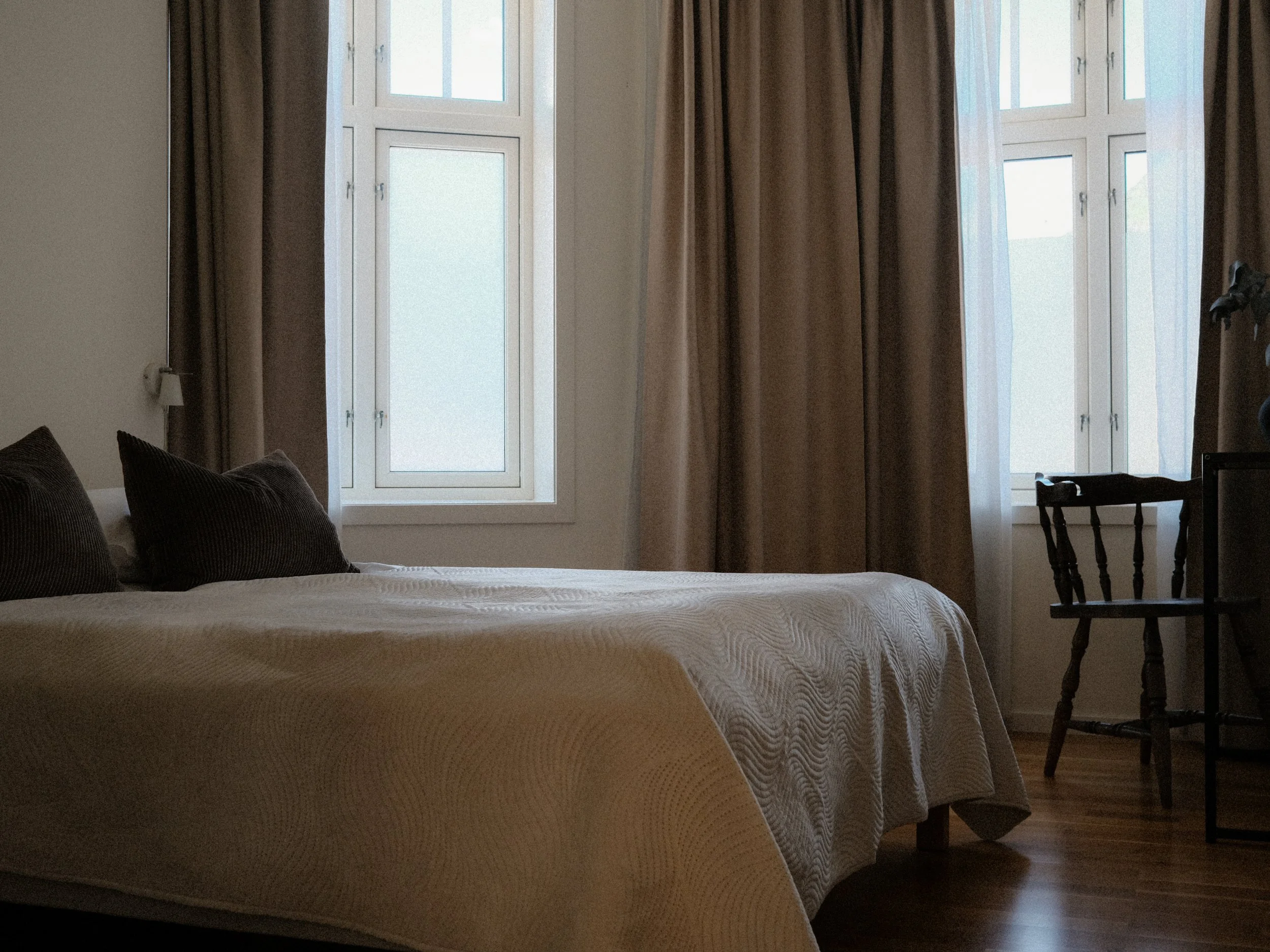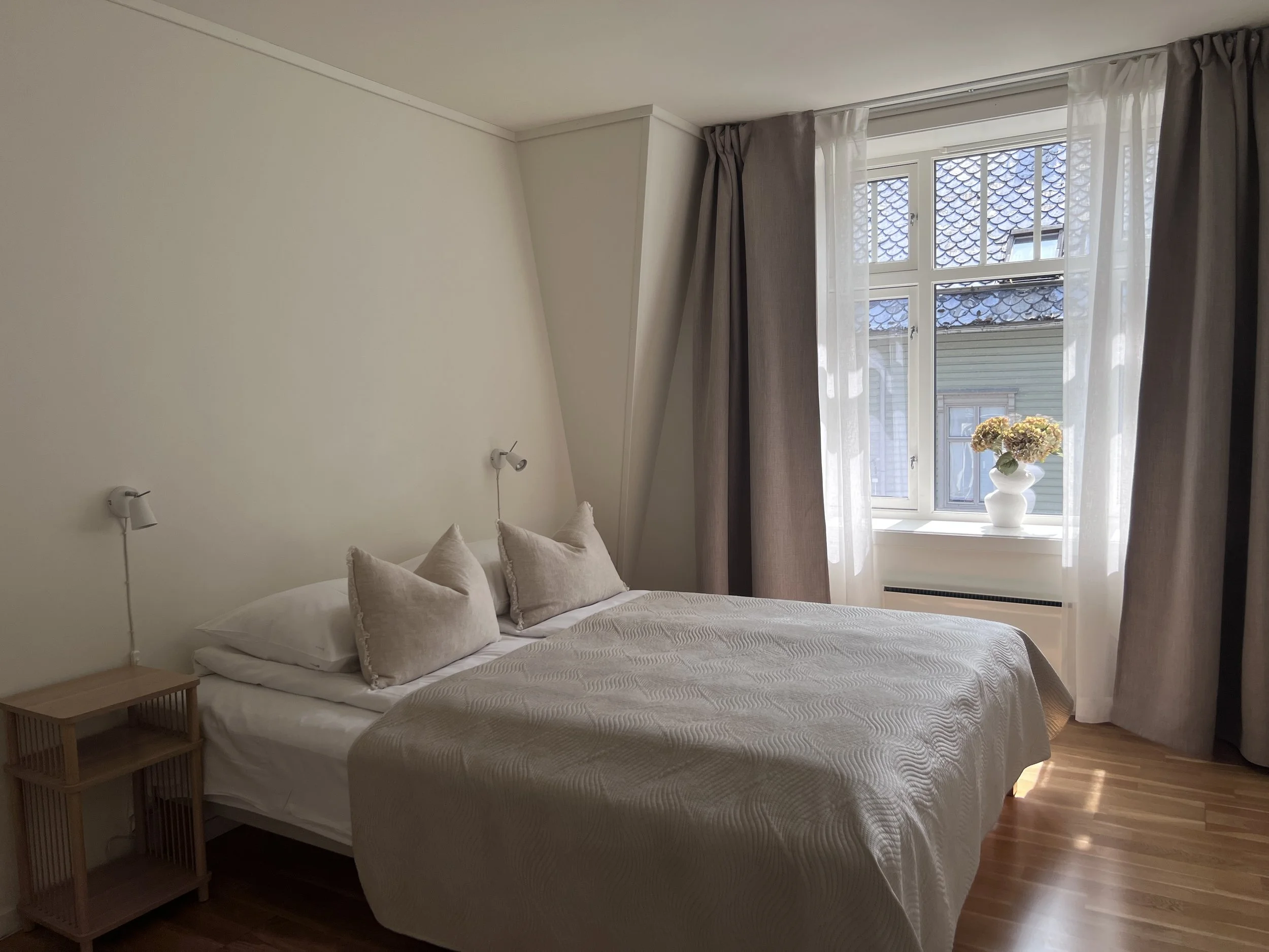 A bright and spacious corner apartment with two bedrooms, each with a double bed (160 cm), and a private balcony with seating – a lovely spot to enjoy the view or relax after a day out.
